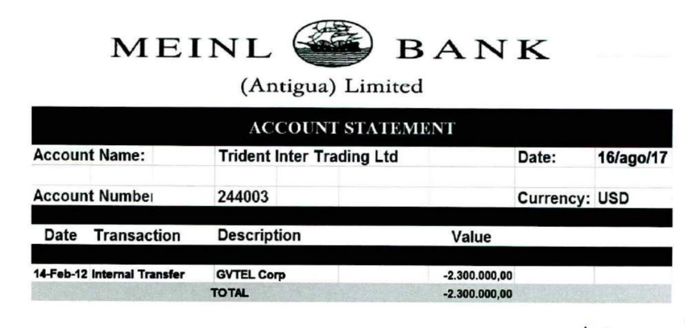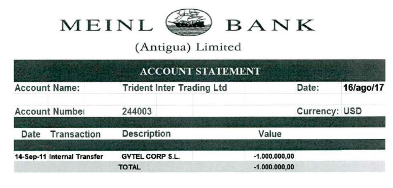 No primeiro extrato, aparece uma transferência de 1 milhão de dólares da offshore Trident para a espanhola GVTEL, de Rodrigo Tacla Durán, em setembro de 2011. Trident era uma das offshores usadas pela Odebrecht através da movimentação bancária do Meinl.