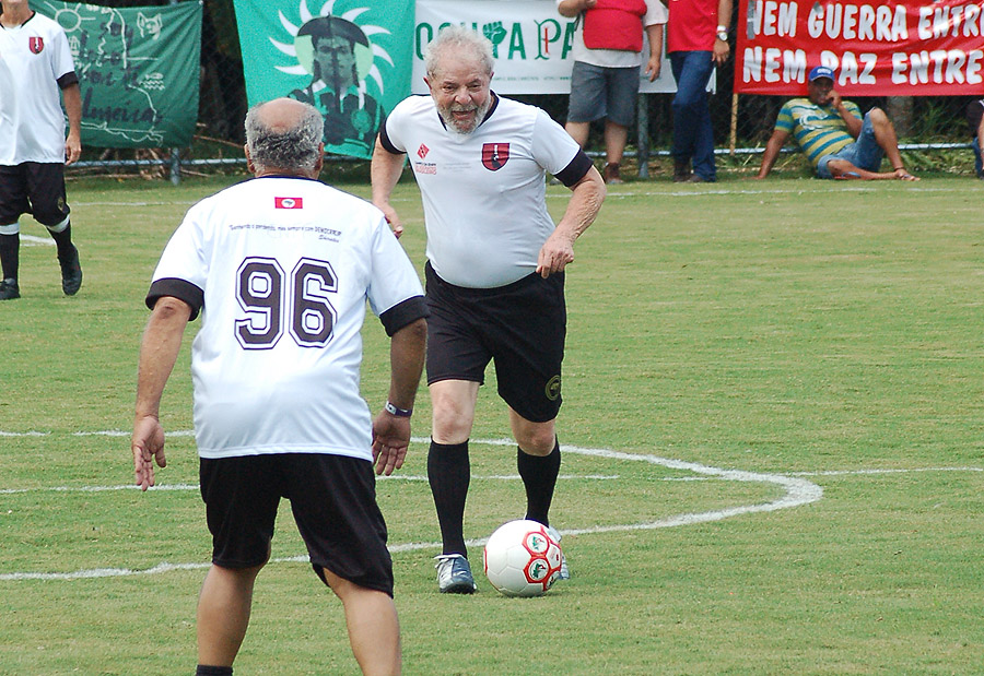 A tantos minutos de jogo, um pênalti é marcado. O ex-presidente Lula coloca a bola na marca de cal, bate e a goleira (era uma goleira) defende. Mas de modo irregular, segundo a arbitragem.